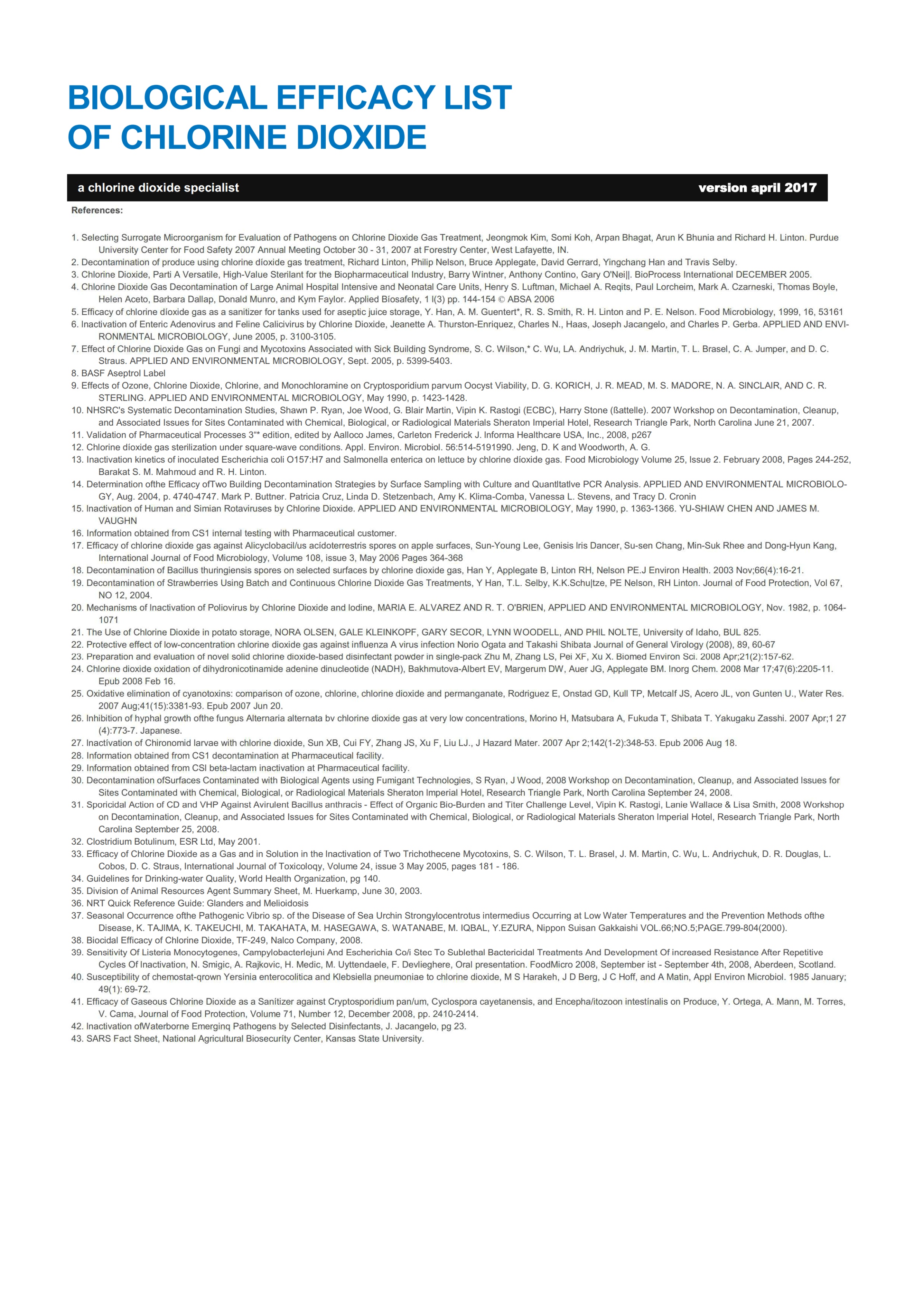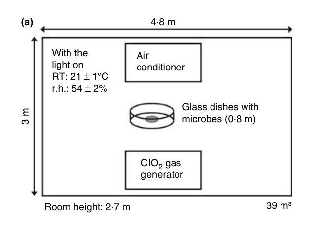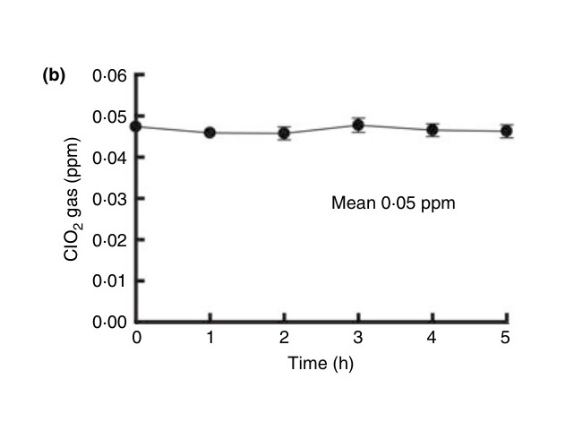 이 연구는 저농도 ClO2 가스 0.05 ppm에서 습식 상태의 그람양성 및 그람음성 박테리아, 외피 및 비 외피 바이러스와 같은 다양한 종류의 미생물을 비활성화 한다는 것을 보여줍니다.