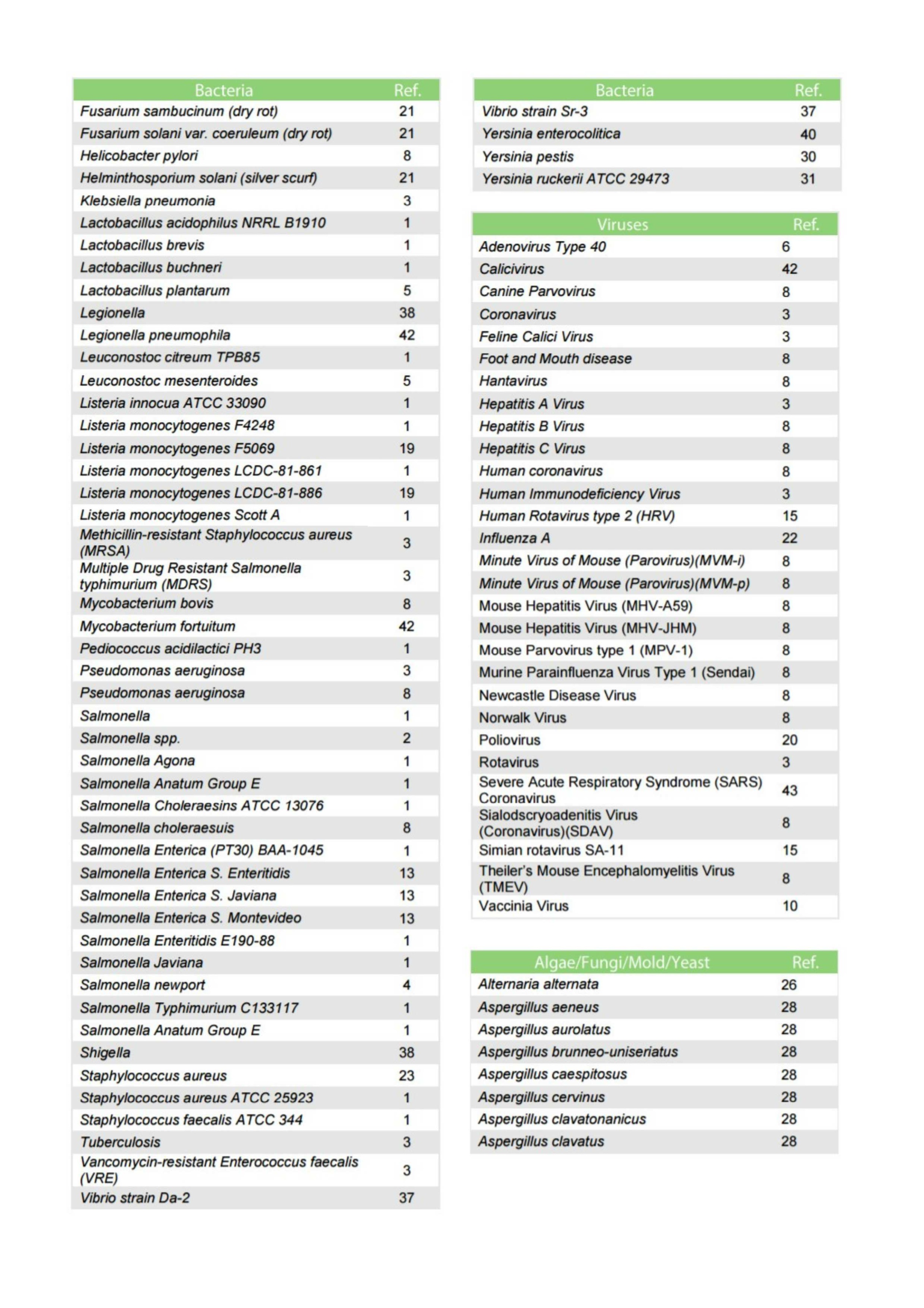 Salmonella choleraesuis, multiple drug resistant Salmonella typhimurium (MDRS), tuberculosis, Escherichia coli 0157:H7 and ATCC 11229, Vancomycin-resistant Enterococcus faecalis (VRE), Klebsiella pneumoniae, and Bacillus subtilis (aspore-forming bacterium)