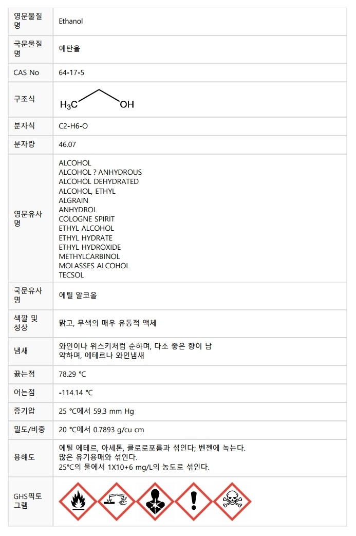 에탄올은 순하며, 다소 기분 좋은 향을 지닌 투명하고 무색의 매우 유동적인 액체이다. 대부분 다양하게 희석되어 알코올 음료로 사용된다. 약제, 향장, 유기합성, 석유화학, 고무, 페인트, 폭발물 산업등 다양한 분야에서 용제 및 부동제로 사용되기도 한다. 에탄올은 눈과 피부의 자극제이다. 급성 중독증상은 초기의 정서적 불안정, 운동조정 능력의 손상, 감각장애, 알굴의 홍조, 빠른 맥박, 발한, 오심구토, 졸음, 무감각 등의 증상 후 최종적으로 힘줄반사가 소실된 혼수상태에 빠지게 된다. 인체에서 에탄올의 치사량은 1~2시간내 섭취 시 50% 에탄올 기준으로 500에서 1000mL사이이다. 임신중의 에탄올 섭취는 태아 알코올 신드롬을 유발할 수 있다. 에탄올은 IARC에 의해 인간에서 암을 유발하는 것이 확실한 1군으로 분류된다.