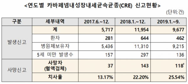 질병관리본부가 이명수 의원에게 제출한 자료에 따르면 지난해 CRE 감염증 발생신고는 1만1954건이며, 이 중 치료가 필요한 환자는 644명이었다. CRE 감염으로 인한 사망자는 143명에 달했다.