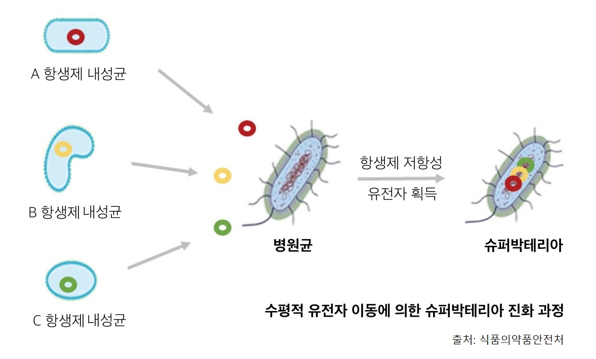 ▷ 감염성 병원균이 다양한 항생제 내성균들로부터 항생제 저항성 유전자들 수평적 유전자 이동 현상에 의해 획득하면, 어떤 항생제로도 치료할 수 없는 슈퍼박테리아로 진화하게 된다.